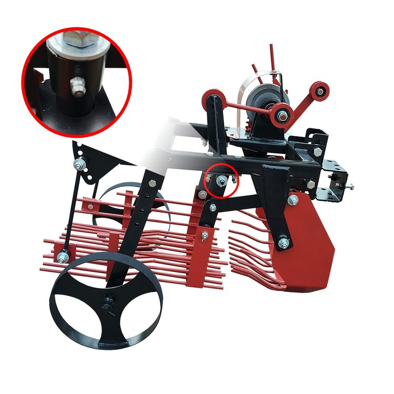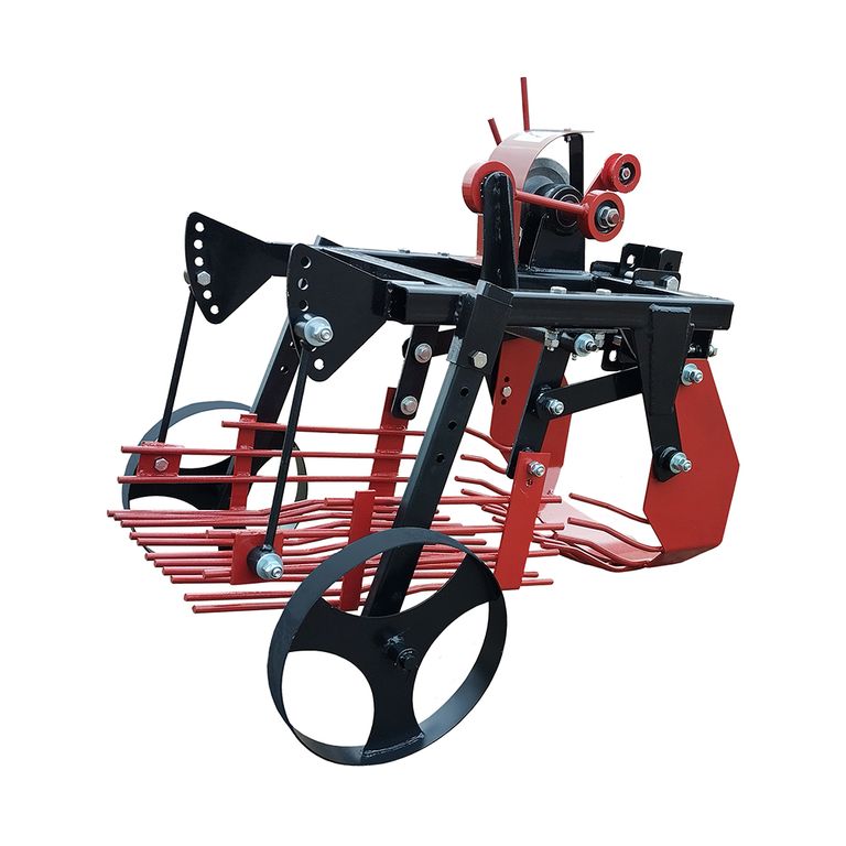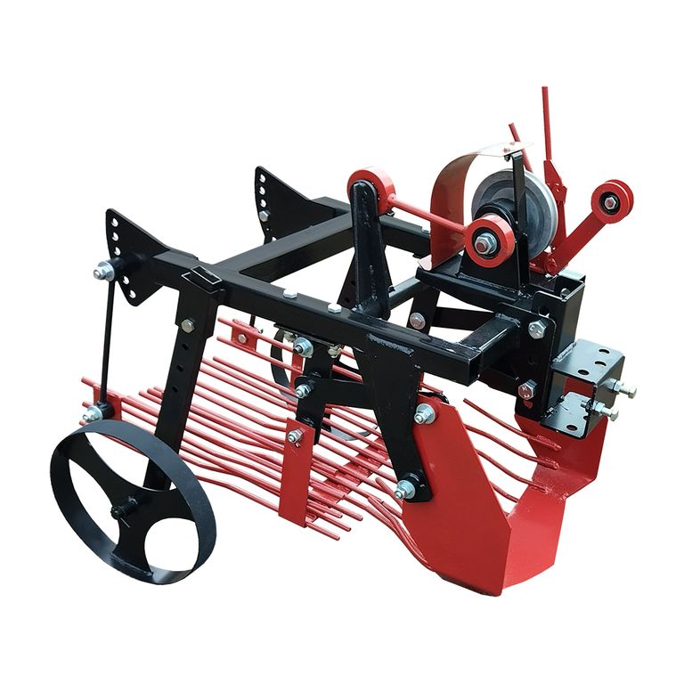 Картофелекопалка для мотоблока - предназначена для механизированного выкапывания клубней картофеля из земли, укладывания на поверхность для дальнейшего ручного собирания. Кроме этого механизм можно использовать для собирания лука, свеклы, чеснока. Модуль состоит из активного лемеха (ножа) и просевной решетки (грохота ). Возможно регулирование глубины выкапывания с помощью опорных колес, мягкость сепарации грунта регулируется с помощью оборотов двигателя мотоблока. Картофелекопалка предназначен для работы на легких и средних почвах при влажности не более 27%, засоренных камнями до 8-9 т/га, при твердости почвы до 20 кг/см2.