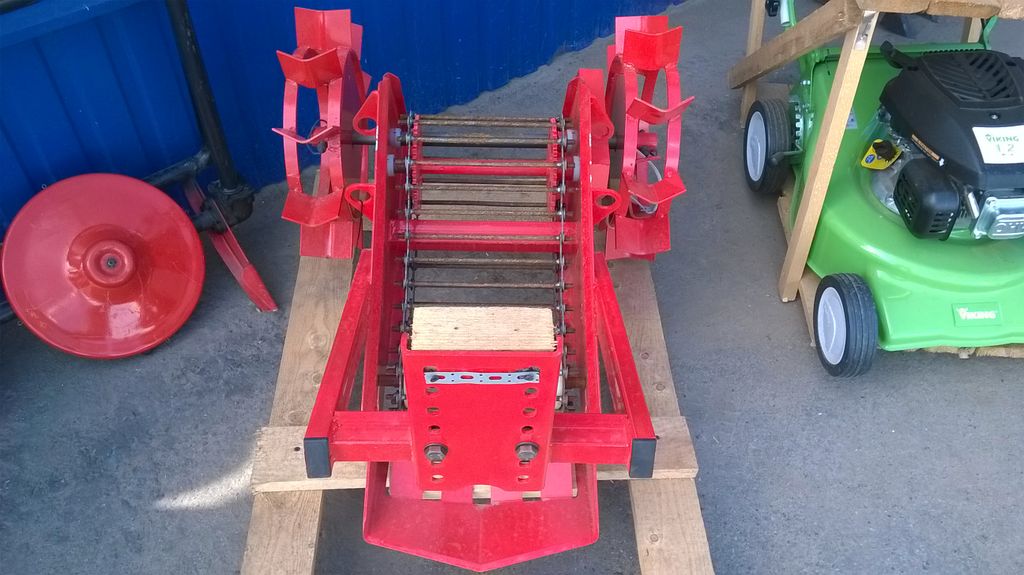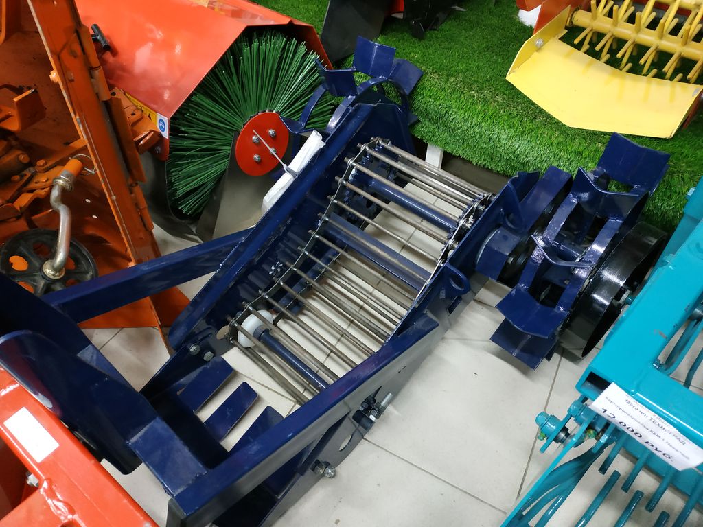 Картофелекопалка для мотоблока является навесным оборудованием и предназначена для механизированного выкапывания клубней картофеля и овощных культур с последующим отсевом земли и выкладкой клубней на поверхность почвы для дальнейшего ручного сбора. Кроме этого механизм можно использовать для собирания лука, свеклы, чеснока. Модуль состоит из лемеха (ножа) и просевной решетки (грохота ). Возможно регулирование глубины выкапывания с помощью сцепки, мягкость воздействия на грунт и клубни регулируется с помощью оборотов двигателя мотоблока.